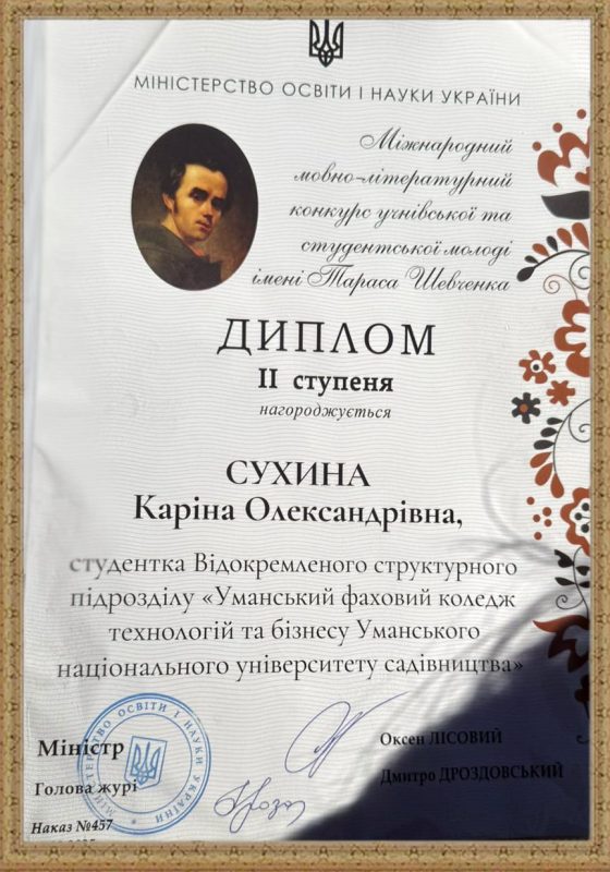 Студентка нашого коледжу Сухина Каріна Олександрівна під керівництвом викладача української мови Нетудихати Ольги Анатоліївни взяла участь у Міжнародному мовно-літературному конкурсі учнівської та студентської молоді імені Тараса Шевченка.