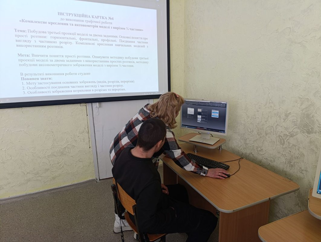 З цією метою викладачі Ангарська Лариса Леонідівна та Деркач Віталій Васильович провели бінарне заняття з дисципліни «Основи нарисної геометрії та інженерна графіка» на тему «Проекційне креслення». Під час заняття студенти ознайомилися з основними принципами виконання проекційних креслень, зокрема з побудовою комплексних проекцій моделей, створенням третьої проекції за двома заданими та застосуванням простих розтинів і поєднанням їх з видами під час виконання навчальних креслень.
